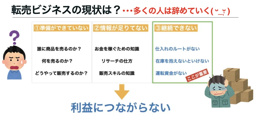 仕入れにお金を使い果たし、在庫だけが部屋を占領し、現金が手元に残らない。この「黒字倒産」に近い状態が、精神的な焦りを生み、挫折へと繋がっていく人をこれまでたくさん見てきました。